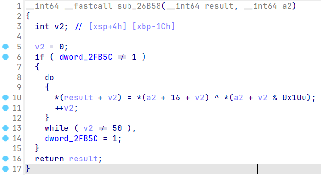 *(a2 + v2 % 0x10u): % 后面是密钥的长度key_lengthwhile ( v2 != 50 ): while循环中的判定条件是密文的长度data_length- 密文和密钥在同一个全局变量中,前