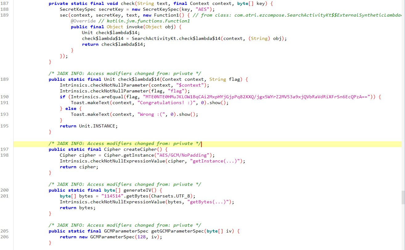 这里可以看到check方法的逻辑,和一些AES相关的信息,是个GCM模式的加密,iv向量直接给了114514