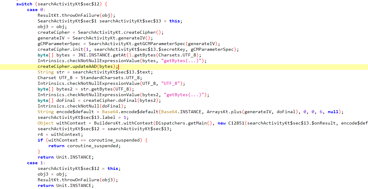 接着找到AES加密的具体过程,发现最后在base64编码的时候会把iv向量和密文一起编码,解码的时候记得去掉