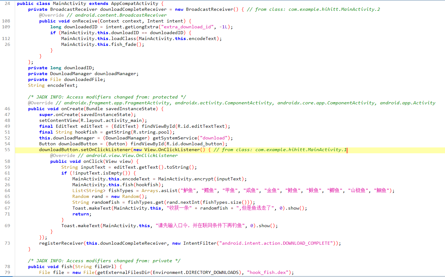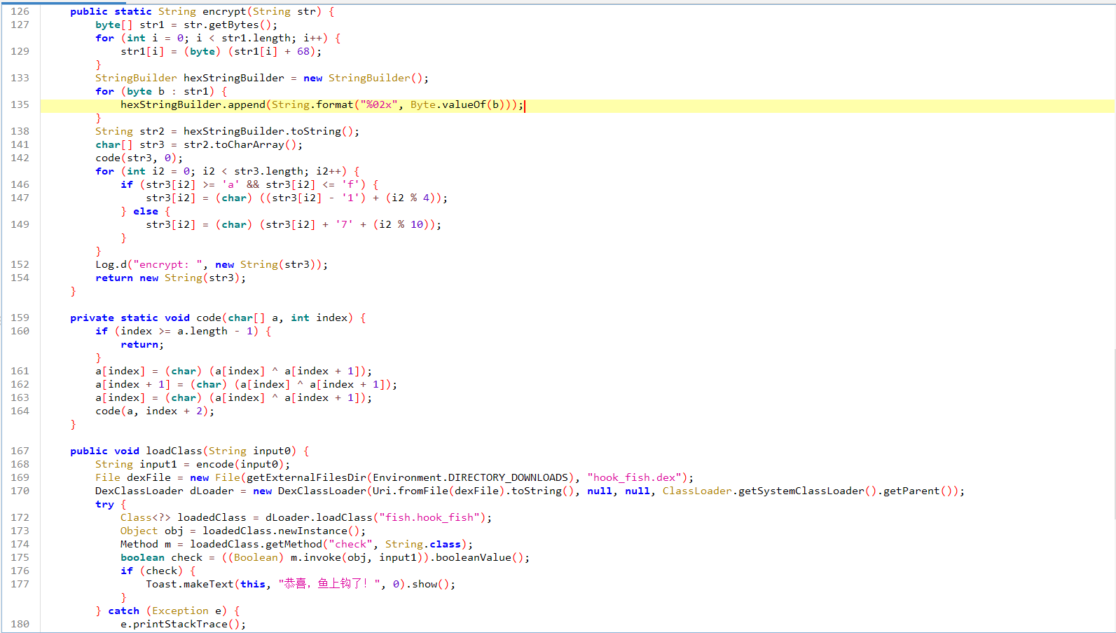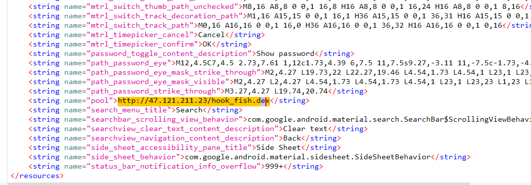 mainactivity中就能看到大部分的验证逻辑,最后的check和encode方法在下载的hook_fish.dex中,从代码中可以看出dex是从url中下载的,那么直接去resource目录找string.xml