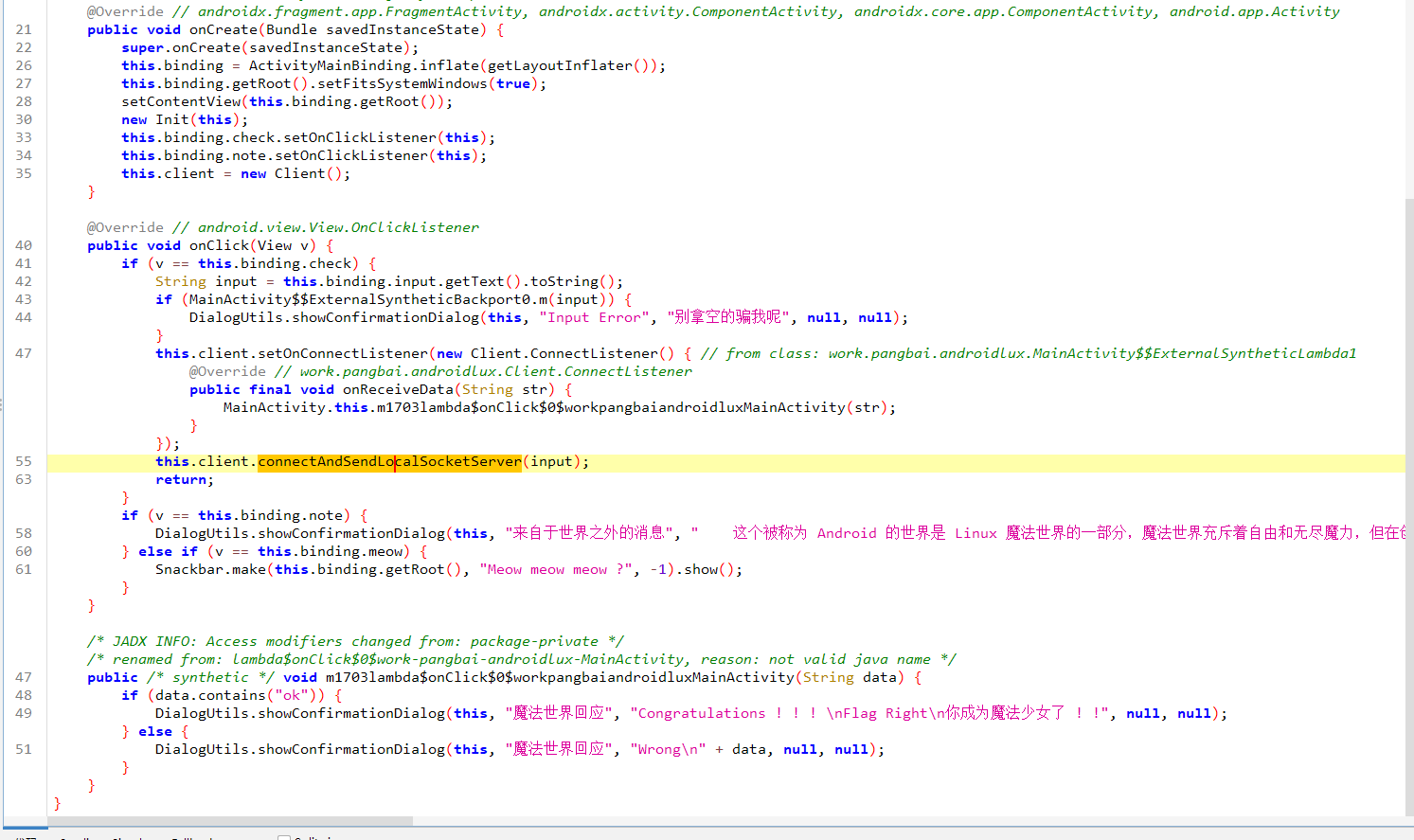 mainactivity主要的方法就是connectAndSendLocalSocketServer,这个方法会判断当前有没有创建线程,有的话就直接与本地的mahoshojo进程通信,将用户的输入传给这个进程处理