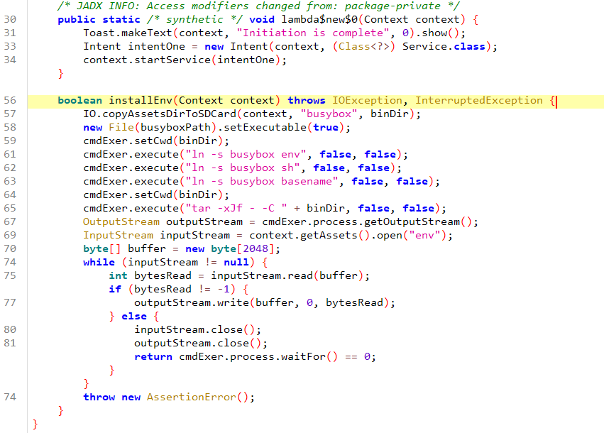 在asset目录下有busybox的可执行文件和env这个压缩包,在Java中可以看到app第一次运行时会解压env并初始化环境