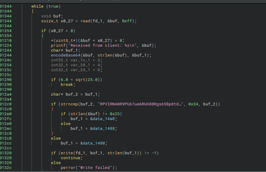 在root/目录下发现一个env可执行文件,BN打开发现是进行了一个自定义的魔改Base64编码,并且会和密文进行对比