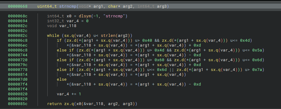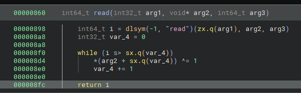 发现/usr/libexec目录下有一个libexec.so,打开一看发现重写了read函数和strncmp函数,难怪解码不对